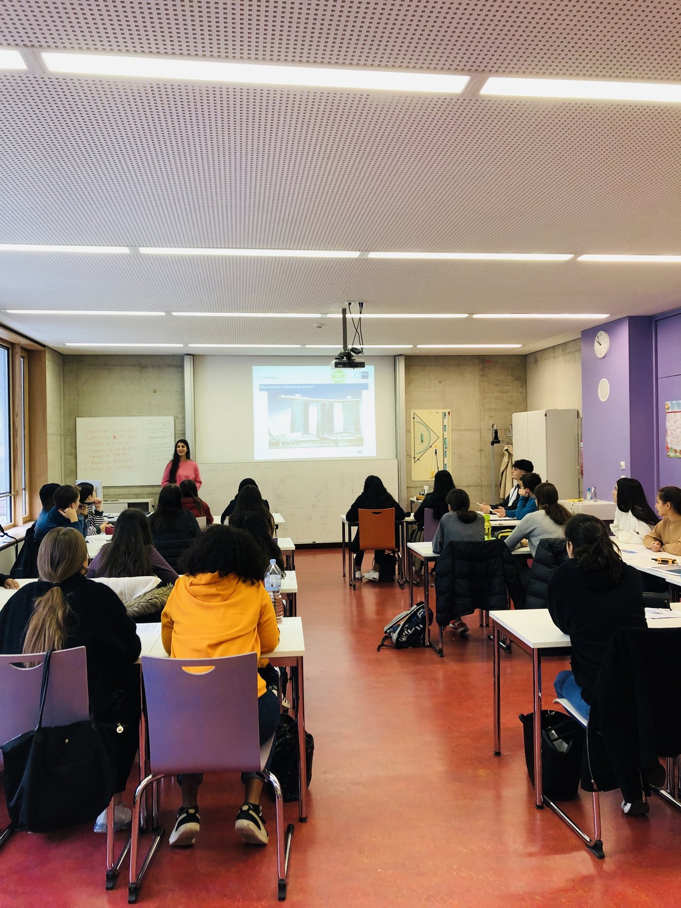 Esra, Max, Daria und Sekander waren zu Gast an der Adam-Kraft-Realschule in Nürnberg. Mit kreativ vorbereiteten Präsentationen könnten die 4 Auszubildenden die Klassen und Lehrer der 10. Jahrgangsstufe für die duale Ausbildung begeistern.