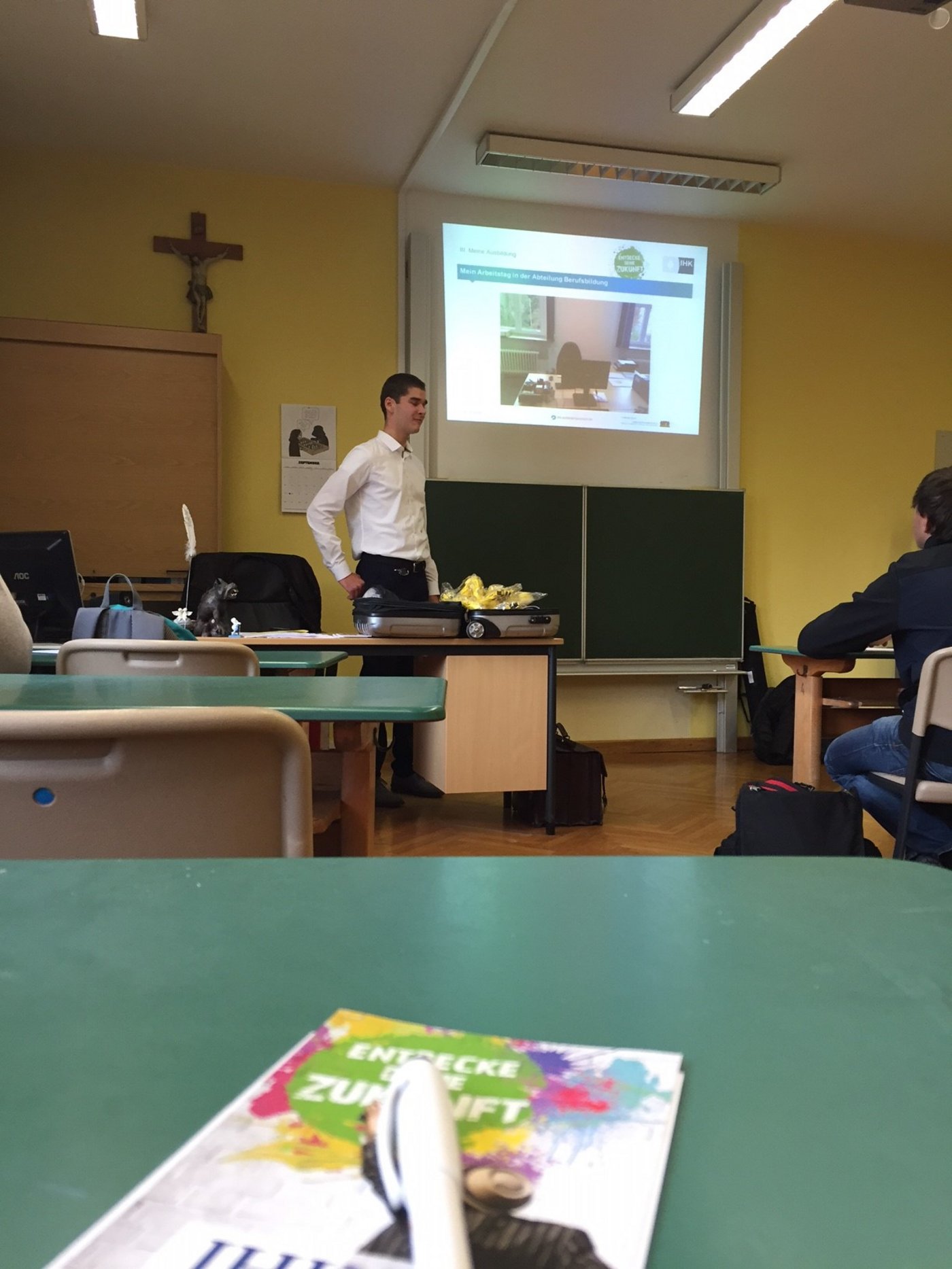 Lukas und Maximilian haben Berufsbilder, die unterschiedlicher nicht sein können: Mechatroniker und Kaufmann für Büromanagement. "Mechatronik ist ein Mix aus Elektro und Metall", erklärt Lukas. Deshalb hat an diesem Vormittag auch ein Strommessgerät und eine Feile dabei. "Die Ausbildung dauert 3,5 Jahre und meinem Chef ist es vor allem wichtig, dass der Azubi in unseren Betrieb passt und sich für den Beruf interessiert. Deshalb kommen alle erst einmal zum Probearbeiten". Insgesamt vier Klassen wurden an diesem Vormittag über die Inhalte der Ausbidlungen informiert. Insbesondere war für die Schülerinnen und Schüler interessant, welchen Schulabschluss man für die Ausbildung haben muss, welche Rolle Noten und Beurteilung im Zeugnis spielen und wie es nach der Ausbildung weitergeht. Alle Fragen konnten unsere AusbildungsScouts beantworten. Es blieb sogar noch Zeit, um Kontakte auszutauschen. Denn der ein oder andere möchte bei der Firma von Lukas ein Praktikum absolvieren. Uns hat es sehr viel Spaß gemacht und wir freuen uns auf den nächsten Besuch im Herbst 2017.