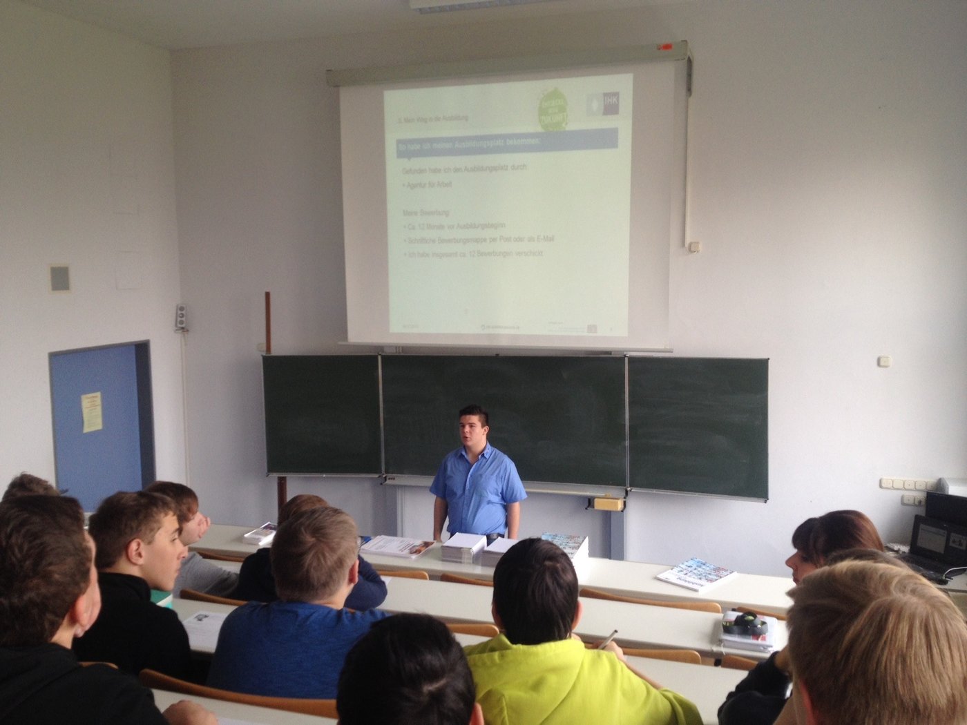 Beide Scouts informierten die Schüler über ihre Berufsschulzeiten und -fächer, über die einzelnen Abteilungen, die sie während ihrer Ausbildung durchlaufen und gaben einen Ausblick, was sie nach der Ausbildung alles machen können.