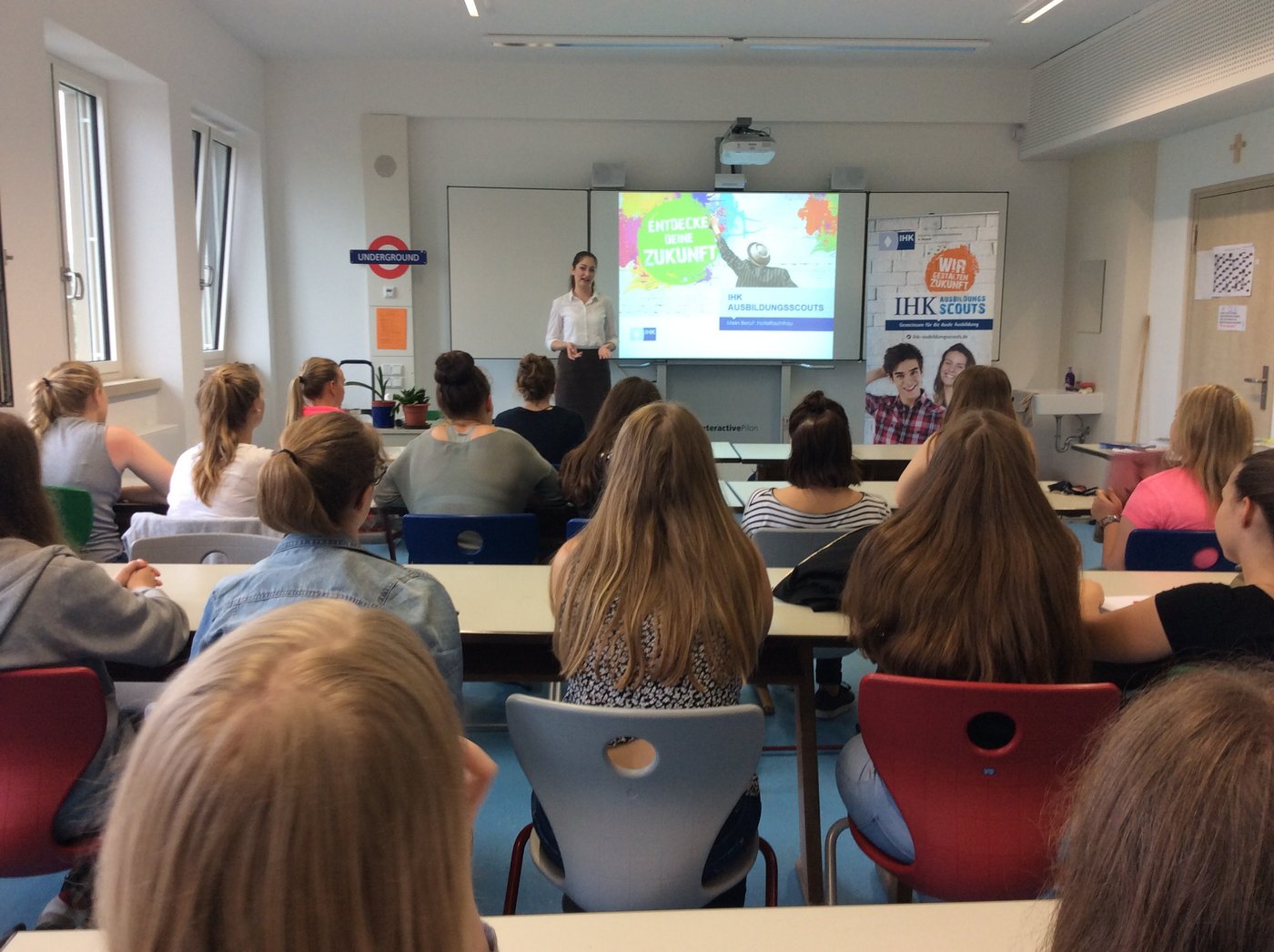 Heute hatte Theresa die Möglichkeit vor den Schülerinnen der Maria-Ward-Schule zu erläutern, warum sie hinter ihre Ausbildung zur Hotelfachfrau steht. Sie möchte nach der Ausbildung gerne ins Ausland gehen und das geht mit diesem Ausbildungsberuf sehr einfach. Ob in die USA oder in die Emirate, überall sind deutsche Hotelfachleute gerne gesehen. Bis sie genau weiß, wohin sieht geht, wird sie erstmal an der Rezeption im Ausbildungsbetrieb weiter Berufserfahrung aufbauen.