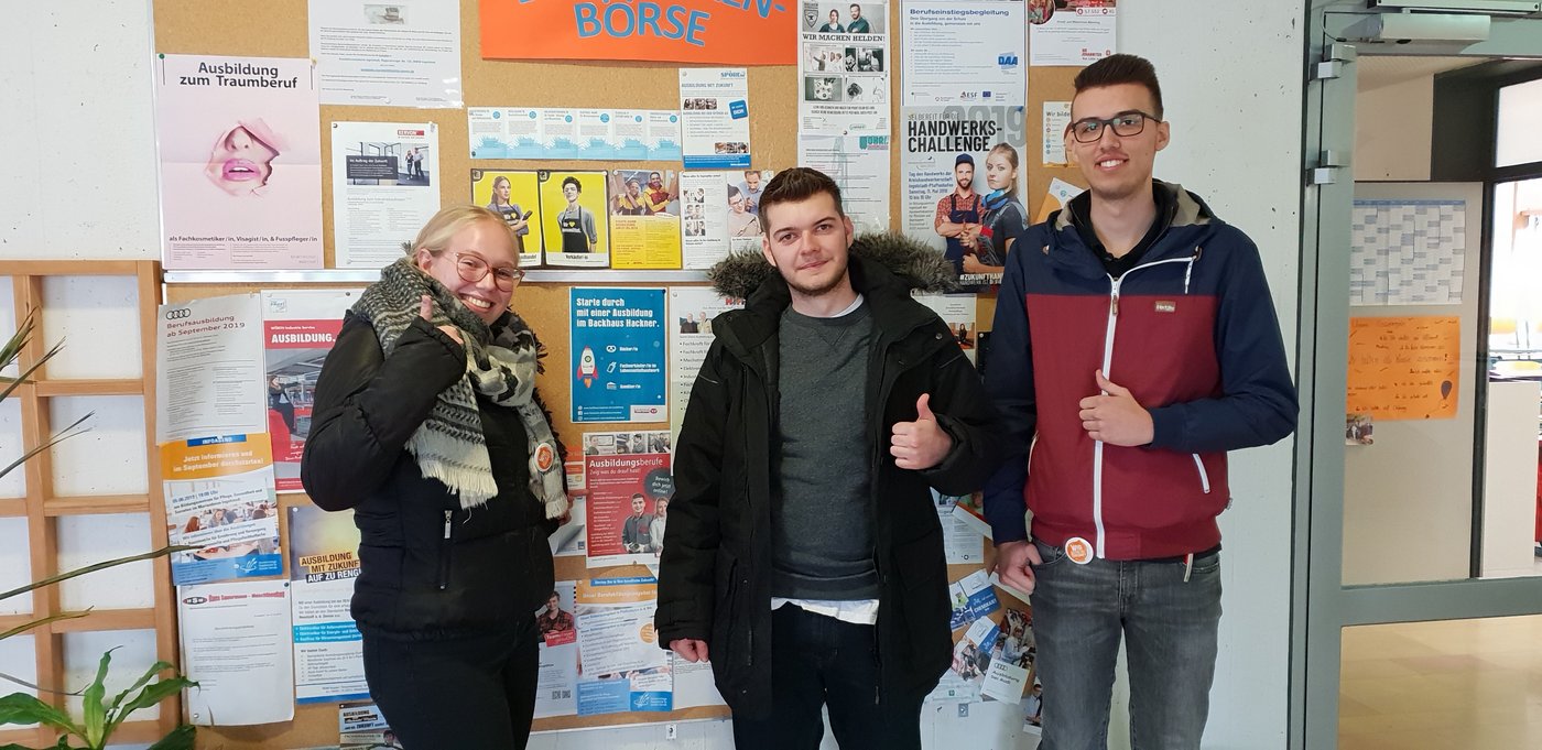 Abgestimmt auf die unterschiedlichen Interessen waren Scouts mit technischen und kaufmännischen Berufen dabei. AusbildungsScout Marco stellte den Beruf des Zerspanungsmechanikers vor. Im Anschluss präsentiere Johanna ihren Beruf der Industriekauffrau. Besonders interessiert wirkten die Schüler als André über die Ausbildung zum Einzelhandelskaufmann berichtete.