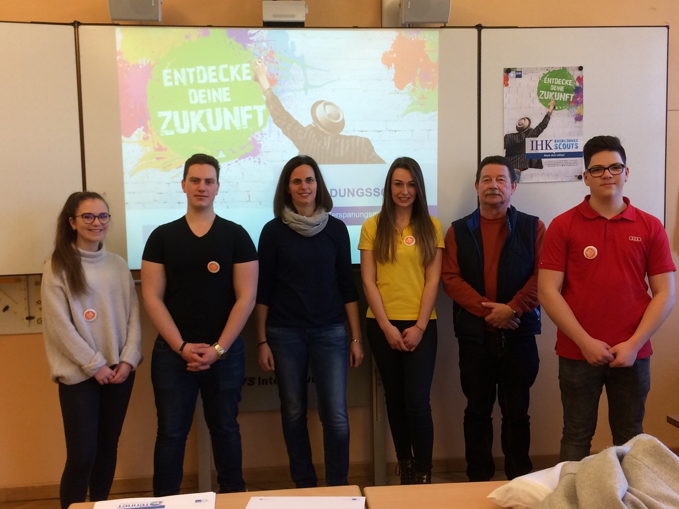 Das dritte Schuljahr in Folge waren am 6. Februar 2018 erneut vier AusbildungsScouts an der Mittelschule an der Pestalozzistraße in Ingolstadt zu Gast. Sie stellten den Regelklassen der 8. Jahrgangsstufe und dem M-Zug der 9. Jahrgangsstufe ihre Ausbildungsberufe Elektroniker/-in für Betriebstechnik, Fachkraft für Lagerlogistik, Kaufmann/-frau im Büromanagement, und Zerspanungsmechaniker/-in vor. Alle vier berichteten über ihren eigenen Weg in die Ausbildung, ihre Tätigkeiten und Lerninhalte sowie ihre Pläne für die Zukunft.