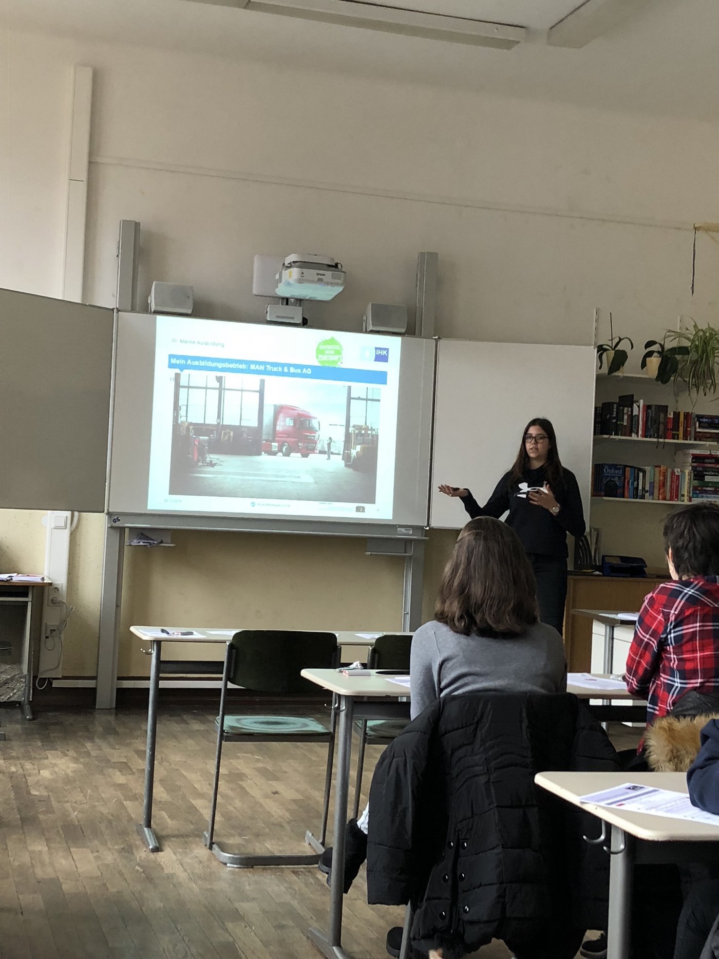 Regina und Leyla besuchten die Johann-Daniel-Preißler-Schule in Nürnberg und informierten einen Tag lang alle Schülerinnen und Schüler des M-Zuges.