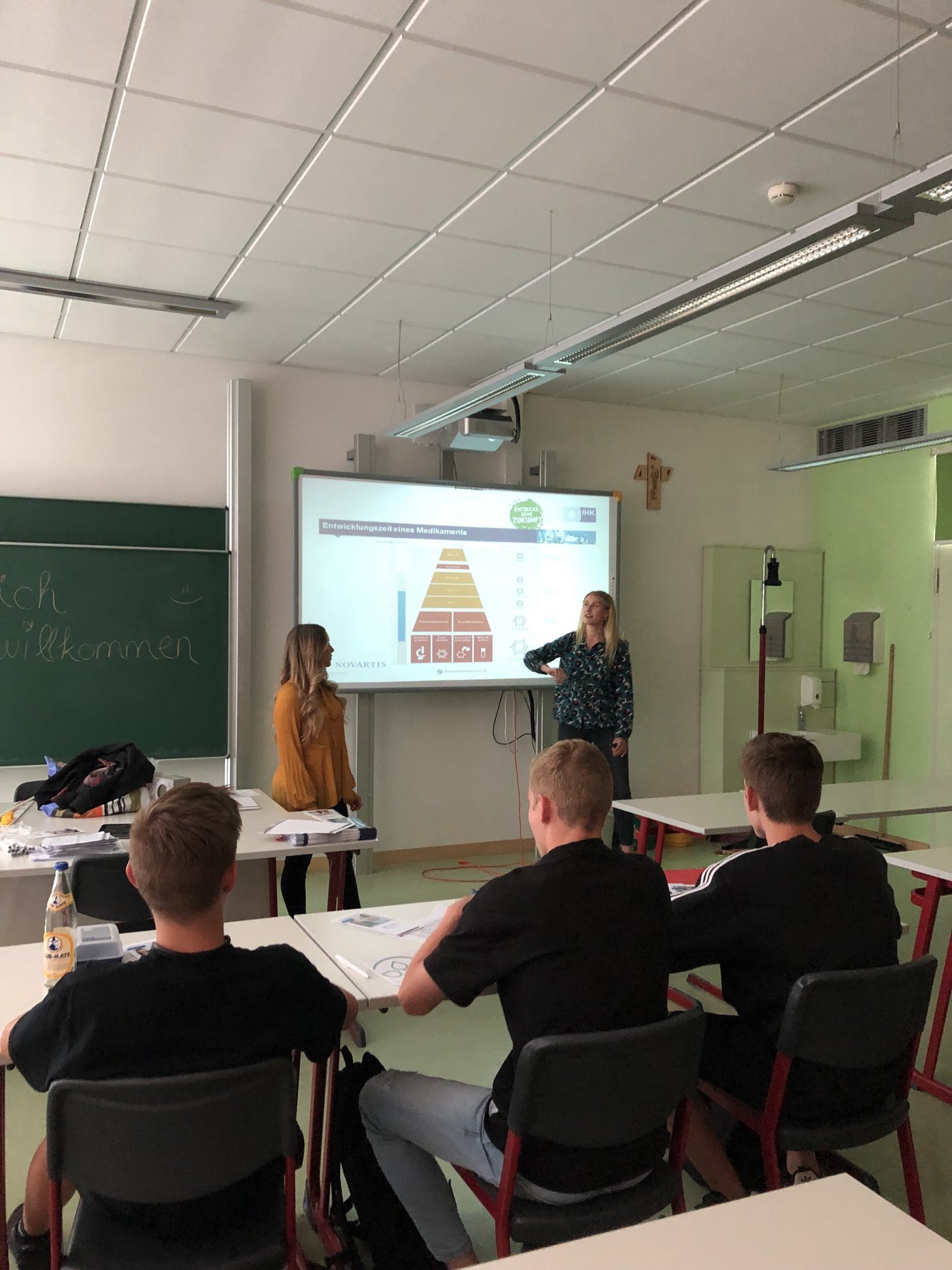 Wie lange dauert die Entwicklung eines Medikamentes? Diese und viele weitere Fragen konnten Sara und Sarina den Schülerinnen uns Schülern der 9. Jahrgangstufe beantworten. Natürlich auch, wie der Ausbildungsalltag einer Industriekauffrau bei Novartis aussieht.