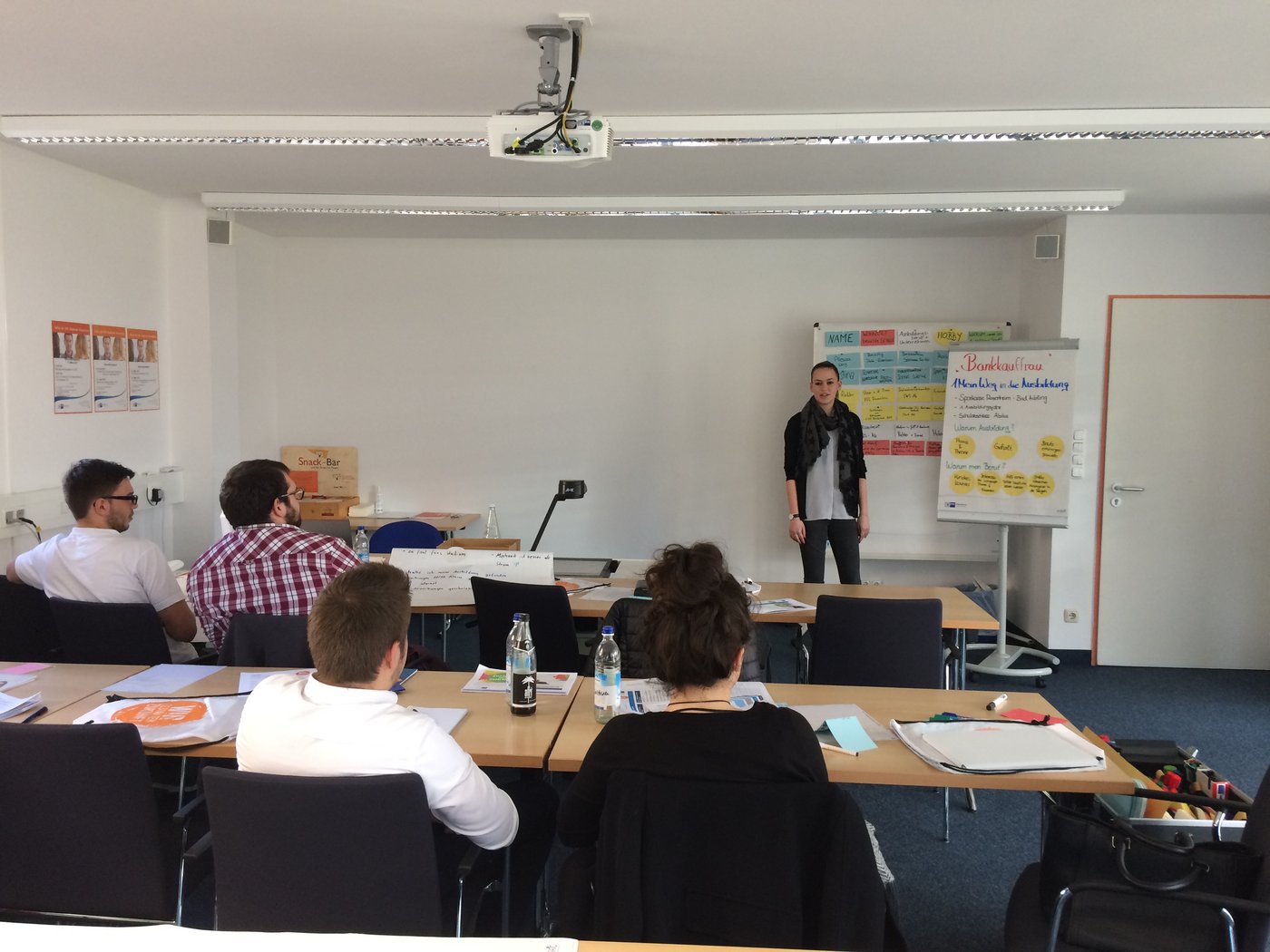 Im Vorbereitungsseminar werden die Azubis auf Ihre Rolle als AusbildungsScouts vorbereitet und üben ihre Präsentation, die sie dann den Schülern an Rosenheimer Schulen vorstellen.