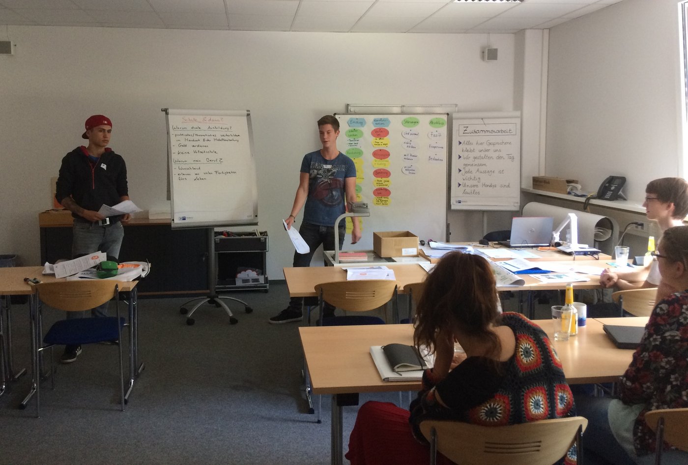 Marque und Luca erlernen beide den Beruf des Industriemechanikers und haben daher ihre Präsentation zusammen erarbeitet und auf FlipCharts vorbereitet. Gemeinsam tragen sie ihre Präsentation zur Übung vor der Scout-Gruppe vor. Im Semiar haben die Schulungsteilnehmer auch Feedbackregeln kennen gelernt und konnten Marque und Luca anschließend konstruktives Feedback zum Vortrag geben.